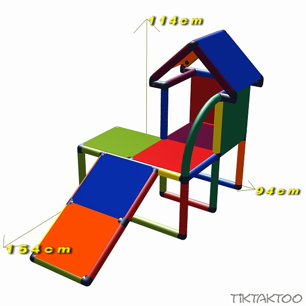 Dieses farbenfrohe Häuschen bietet den Kleinen viel Spaß, übt die Motorik und ermöglicht immer wieder neue Möglichkeiten, sich auszuprobieren. Er hat eine Kleinkinderutsche die zum Rutschen einlädt, das Spielvergnügen abrundet und das Interesse Ihrer Kinder lange wach hält. Das Modell selbst kann mit weiteren Einzelteilen durch eigene Ideen und bauseitliche Gegebenheiten geändert werden. Mit ein wenig Phantasie wird umgebaut ein Regal, eine Kuschelhöhle oder gar ein ganzer Kletterpark.